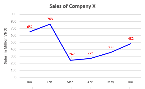 A line chart consist of series of data points connected by straight lines. It is used frequently to show the trend or variation of a variable over time. For example, the sales of a company in 6 months is shown in Table 2 and Fig. 3.