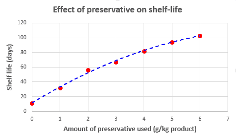 Scatter charts are used to show the relationship between two numerical variables `x` and `y`. They are plots of paired `(x,y)` data. A scatter plot consists of a horizontal `x` axis and a vertical `y` axis. The data are paired in such a way that they combine each value of variable `x` with a corresponding value of variable `y`, and this combination is represented by a point in chart. We can add a line (straight or curved) to represent the general relation of `x` and `y`. For example, Table 3 and Fig. 4 show the result of an experiment that study the effect of amount of preservative used on shelf life of a meat product.